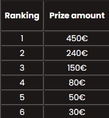 - Each week a prize pool of 125.000€ will be distributed as shown below: