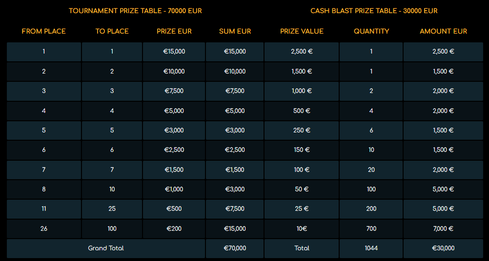 - Cash Blast: any real money spin on the qualifying games can trigger a random Cash Blast prize from its own prize pool. Prize pool: €10.000