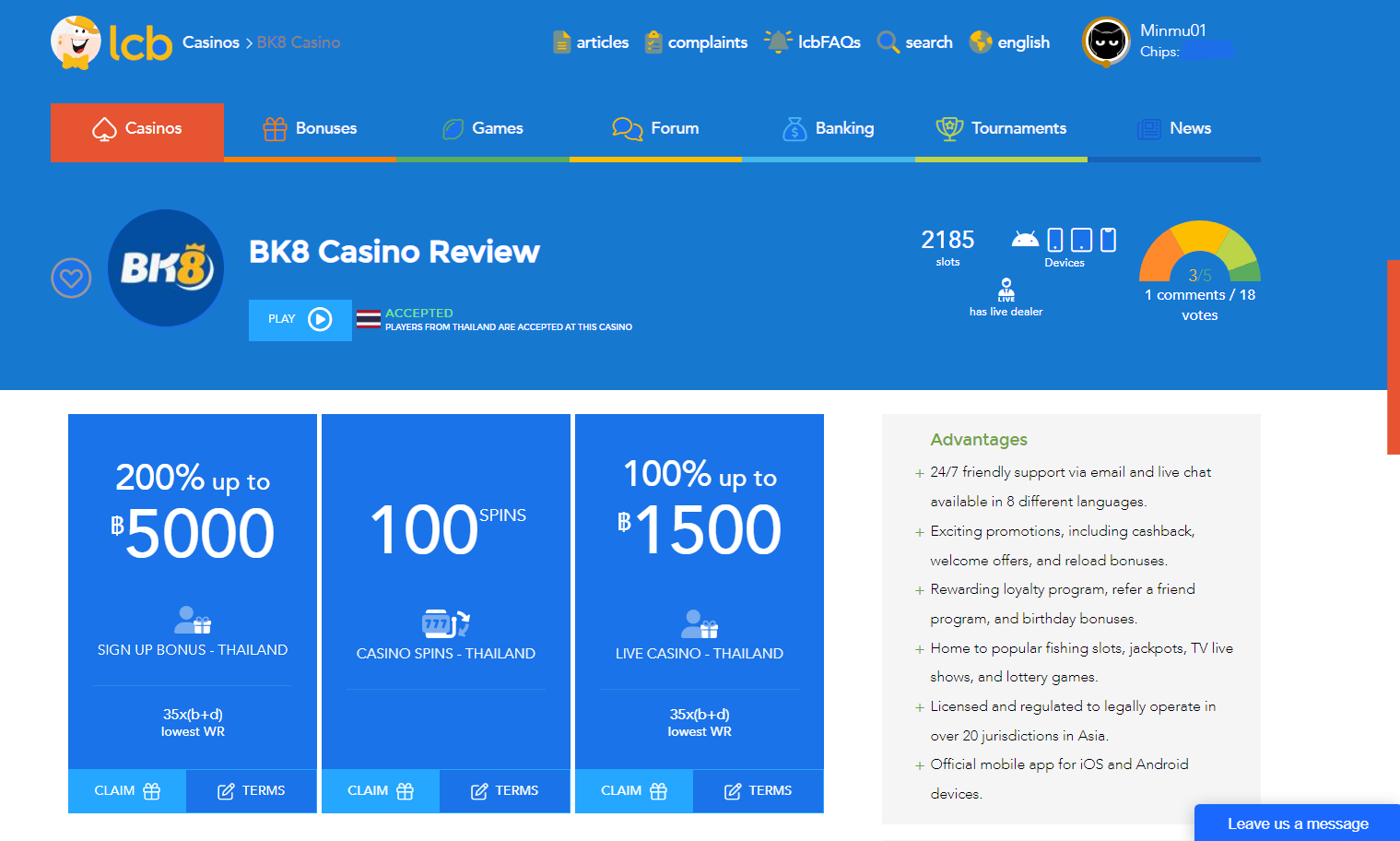 2.BK8 Casino $36.25 No Deposit Wagering 1x