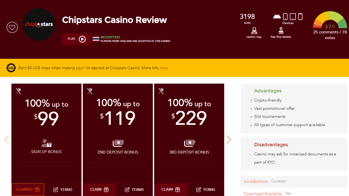 All bonuses are sent to personal emails. Most of the casinos I played at, I got $3 from LCB. Pros: Less problems than the usual casinos advertised on the internet.