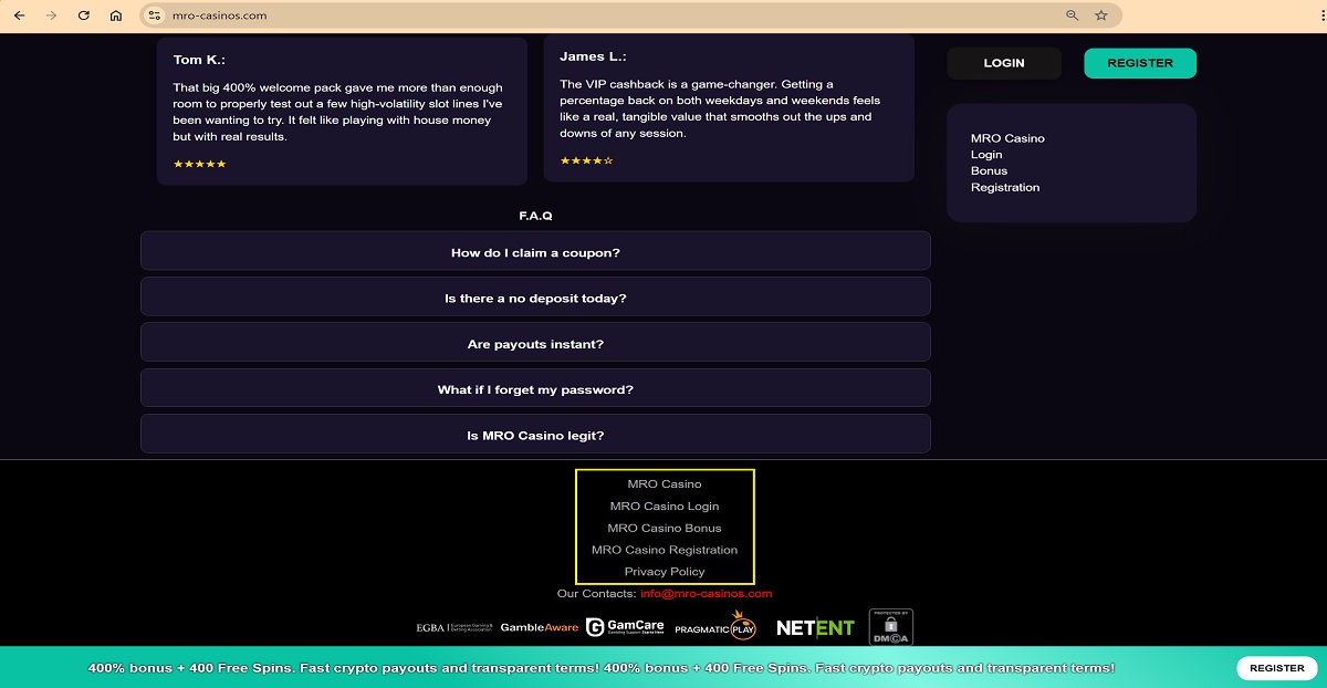 Players are strongly advised to avoid mro-casinos.com. The site does not operate a legitimate casino platform and relies on brand misuse, misleading design, and affiliate redirection tactics.