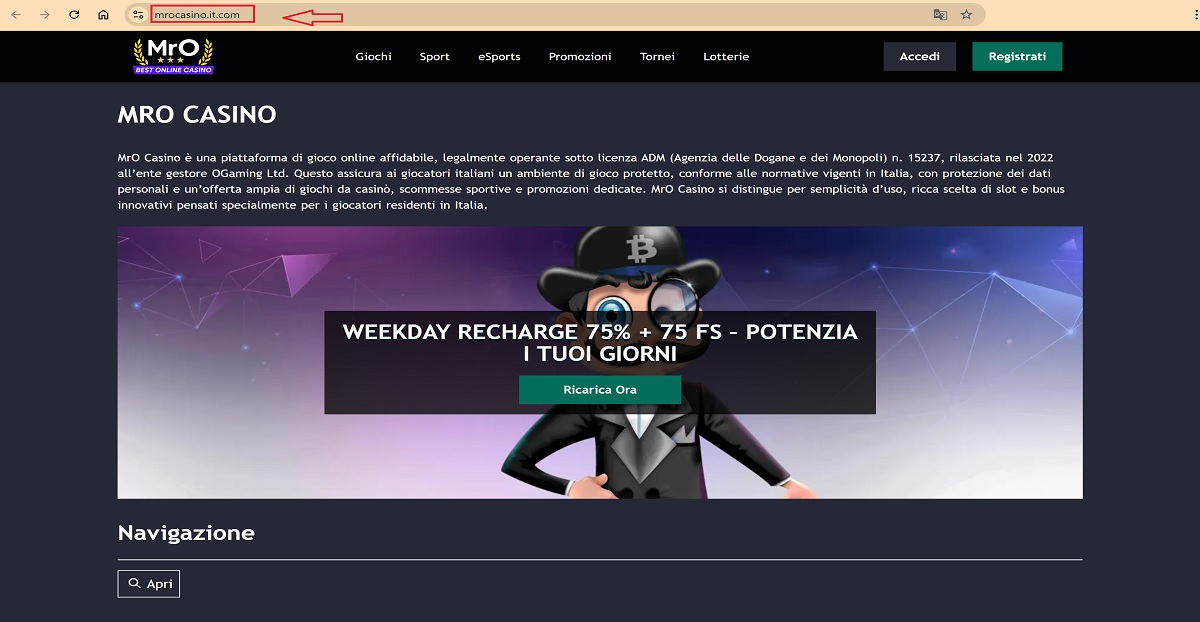 Apesar de utilizar o nome MrO Casino e conteúdo promocional em italiano, o domínio não apresenta qualquer declaração de licenciamento identificável ou informações regulamentares transparentes. O site parece aproveitar o reconhecimento da marca e a linguagem promocional para criar uma impressão de legitimidade sem suporte verificável.