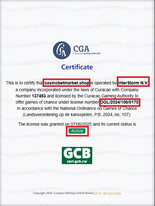 O documento publicado no site casinobetmarket.shop indica a InterStorm (Curaçao) NV (número de registo da empresa 137453) como detentora da licença e faz referência ao número de licença OGL/2024/106/0170, afirmando que a licença foi emitida em 07/06/2025 e que o seu estado atual é ATIVO. No entanto, esta informação é inconsistente com o estado da licença exibido no site oficial da Autoridade de Jogos de Curaçau (GCA).