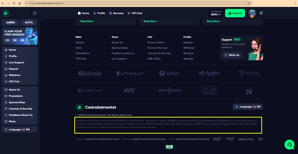 "O Casinobetmarket.shop é propriedade e operado pela InterStorm NV, número de registo: 137453, endereço registado: 17 Santa Rosaweg, Willemstad, Curaçau. A empresa agente de pagamentos é a Medium Rare Limited, com endereço em 7-9 Riga Feraiou, LIZANTIA COURT, Escritório 310, Agioi Omologites, 1087 Nicósia, Chipre, e número de registo: HE 347341."