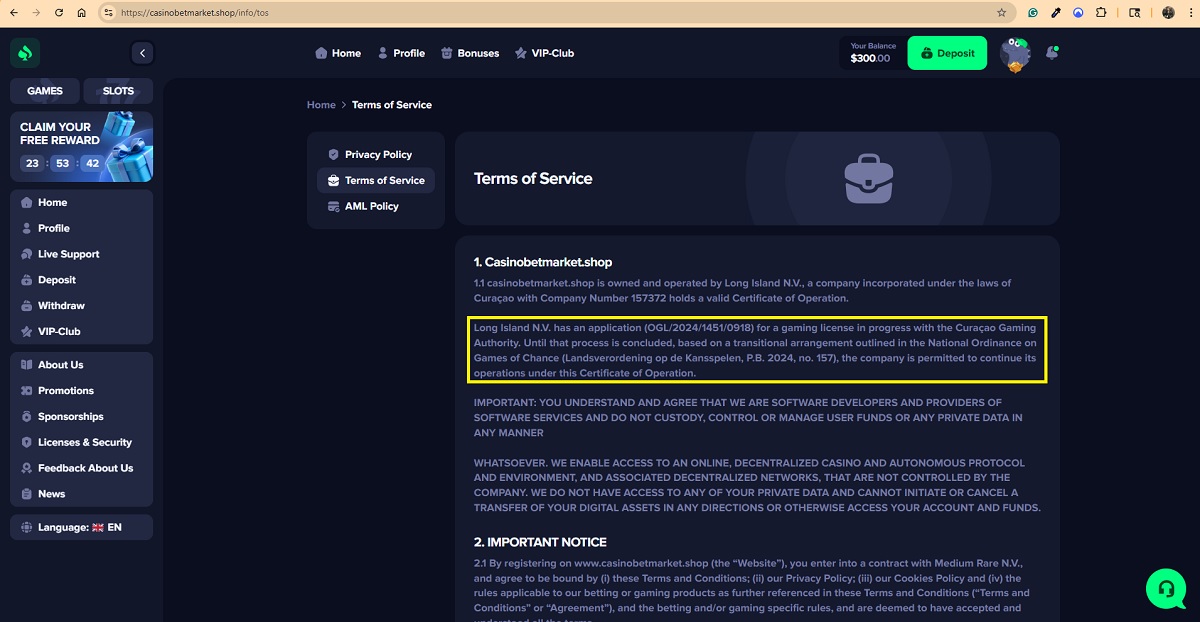Based on official records and the information presented on the website, there are clear inconsistencies regarding company ownership. InterStorm (Curaçao) N.V., listed as the owner in the website footer and on the license and security page, was officially dissolved on 10 November 2025 and therefore cannot legally own or operate the casino. Meanwhile, the casino’s Terms and Conditions identify Long Island N.V. as the owner, despite its registration having been discontinued as of 2 October 2024.
