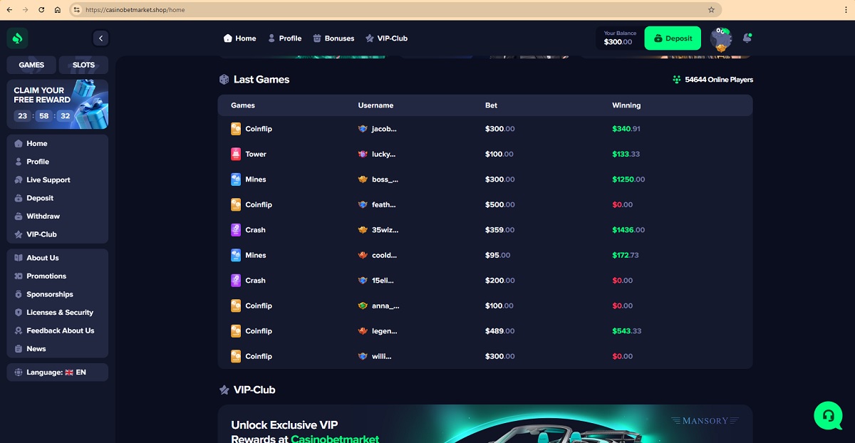 O Casinobetmarket.shop opera sem uma licença de jogo válida, utiliza fornecedores de jogos falsos e engana os jogadores com alegações regulamentares enganosas. Depositar dinheiro nesta plataforma acarreta um elevado risco financeiro. Recomenda-se vivamente que os jogadores evitem este casino.