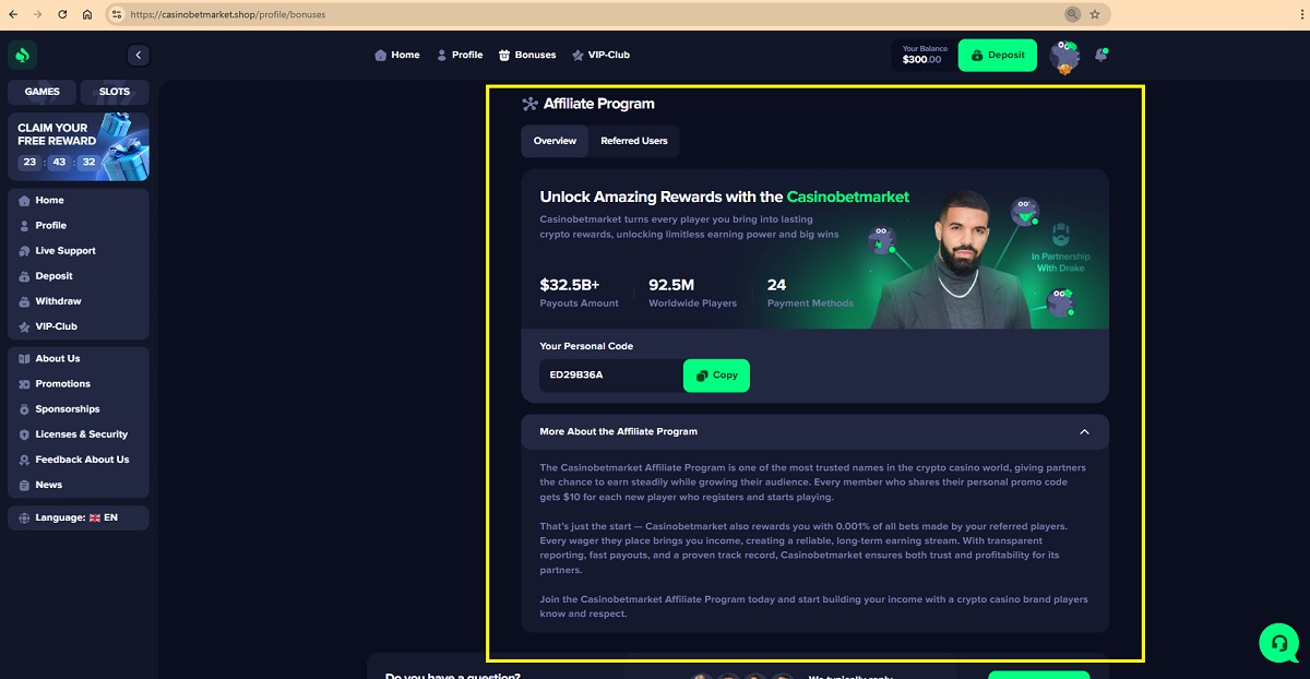 Based on the available public information, there is no verifiable evidence that a legitimate iGaming or crypto casino affiliate program operated under the name “Casinobetmarket Affiliate Program” currently exists. The claims describing a Casinobetmarket Affiliate Program — including guaranteed payments of $10 per registered player, ongoing earnings of 0.001% of all bets, and references to transparent accounting and fast payouts — cannot be substantiated through reliable or industry-recognized sources.