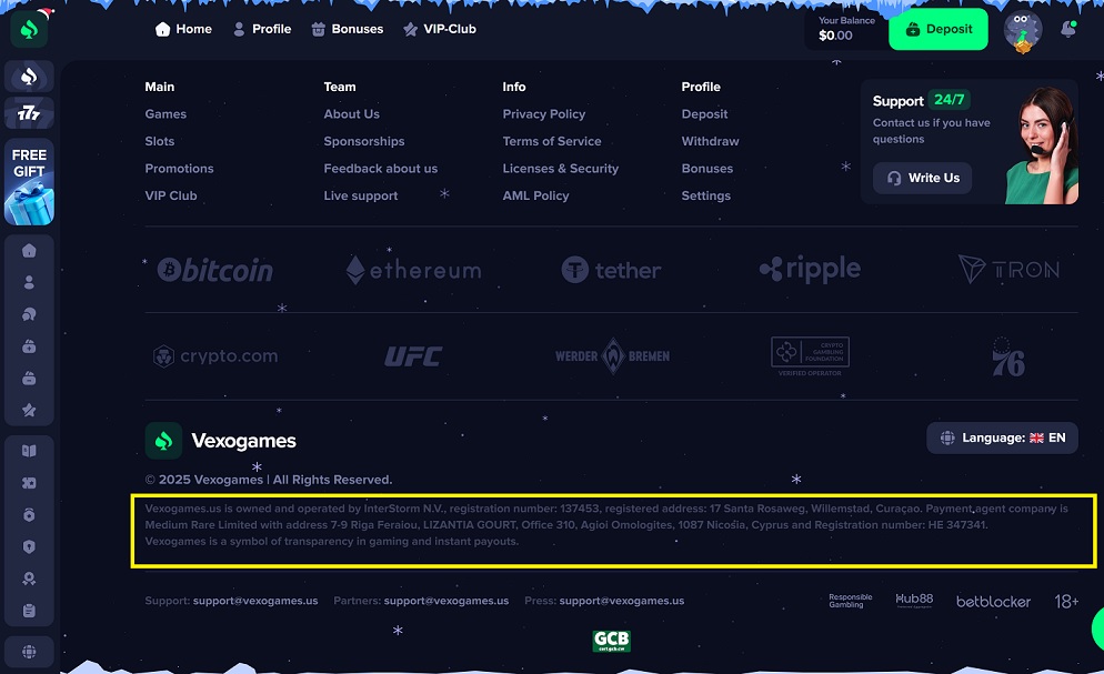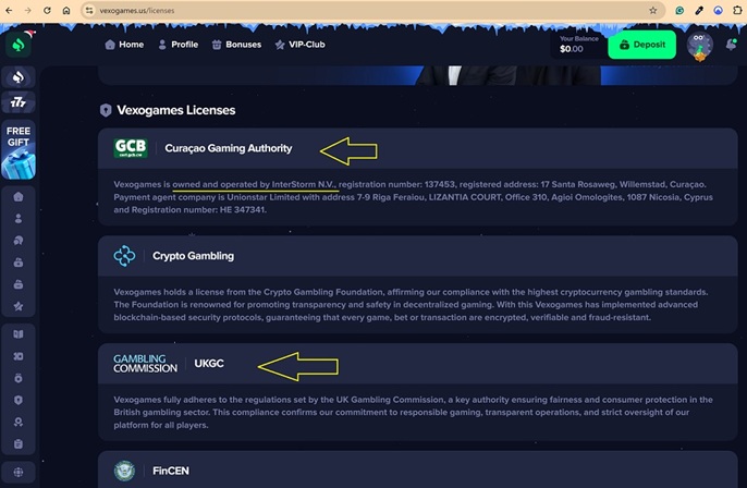 ➡️ Conclusion: Vexogames.us Casino is not licensed by either the Curaçao Gaming Authority or the UK Gambling Commission and provides inconsistent ownership disclosures.