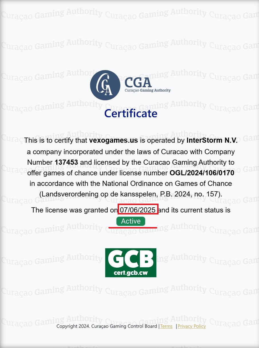 O documento publicado no site Vexogames.us indica a InterStorm (Curaçao) NV (número de registo da empresa 137453) como detentora da licença e faz referência ao número de licença OGL/2024/106/0170, afirmando que a licença foi emitida em 07/06/2025 e que o seu estado atual é ATIVO. No entanto, esta informação é inconsistente com o estado da licença exibido no site oficial da Autoridade de Jogos de Curaçau (GCA) .