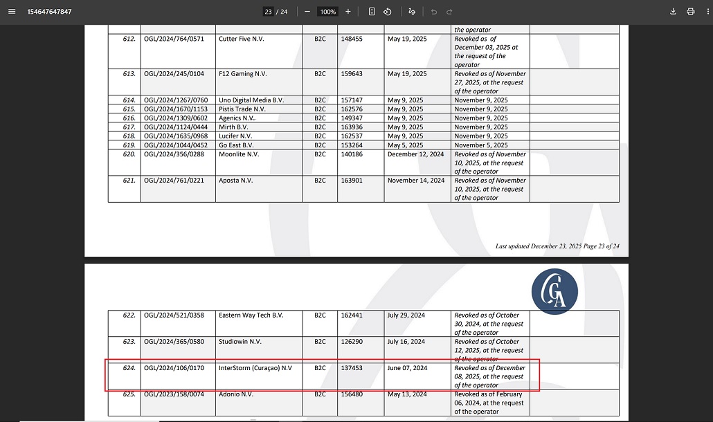 On the official Curaçao Gaming Authority (CGA) website, InterStorm (Curaçao) N.V. is listed with a license that was issued on 07.06.2024, but the license was revoked on 8 December 2025 at the request of the operator.