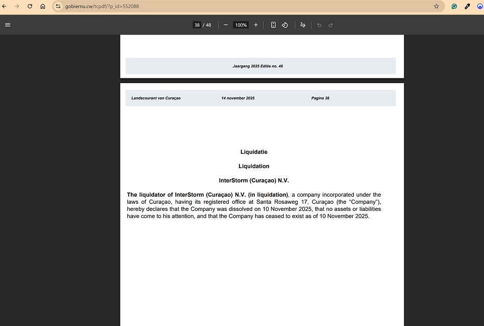 An official notice in the Curaçao Gazette on the government website, “Gobièrnu di Kòrsou,” confirms that InterStorm (Curaçao) N.V. was officially dissolved.
