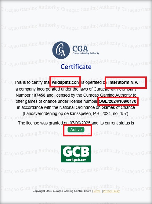 The document published on the wildspinz.com website lists InterStorm (Curaçao) N.V. (company registration number 137453) as the license holder and references license number OGL/2024/106/0170, stating that the license was issued on 07.06.2025 and that its current status is ACTIVE. However, this information is inconsistent with the license status displayed on the official Curaçao Gaming Authority (GCA) website.