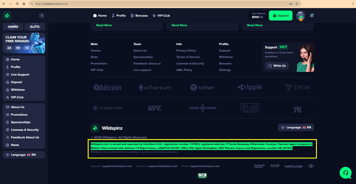 "wildspinz.com is owned and operated by InterStorm N.V., registration number: 137453, registered address: 17 Santa Rosaweg, Willemstad, Curaçao. Payment agent company is Medium Rare Limited with address 7-9 Riga Feraiou, LIZANTIA COURT, Office 310, Agioi Omologites, 1087 Nicosia, Cyprus and Registration number: HE 347341."