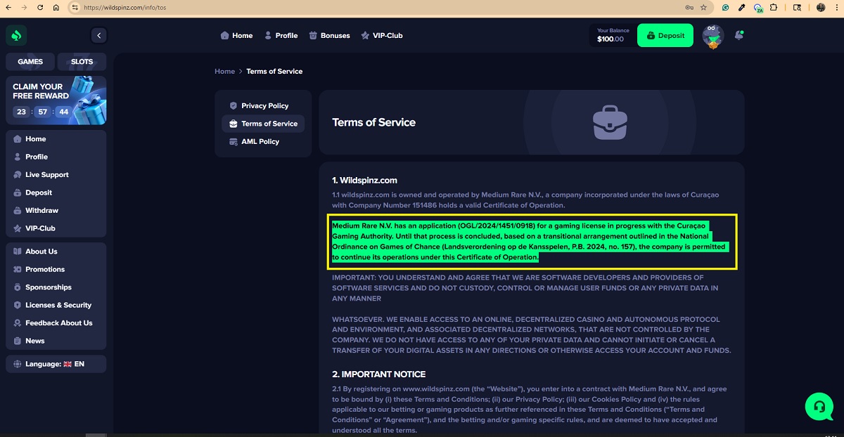 De acordo com o site oficial da Autoridade de Jogos de Curaçau (CGA), a licença número OGL/2024/1451/0918 pertence a uma empresa diferente, a Medium Rare NV (número de registo da empresa 145353). A licença foi emitida em 9 de junho de 2025 e expirou em 9 de dezembro de 2025.