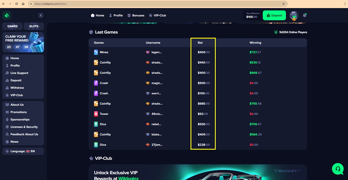A plataforma do casino exibe uma lista de apostas e ganhos recentes atribuídos a supostos jogadores. Os valores apresentados incluem apostas com valores excecionalmente elevados e ganhos elevados frequentes, o que parece inconsistente com o comportamento realista de um jogador e com os padrões de jogo padrão.