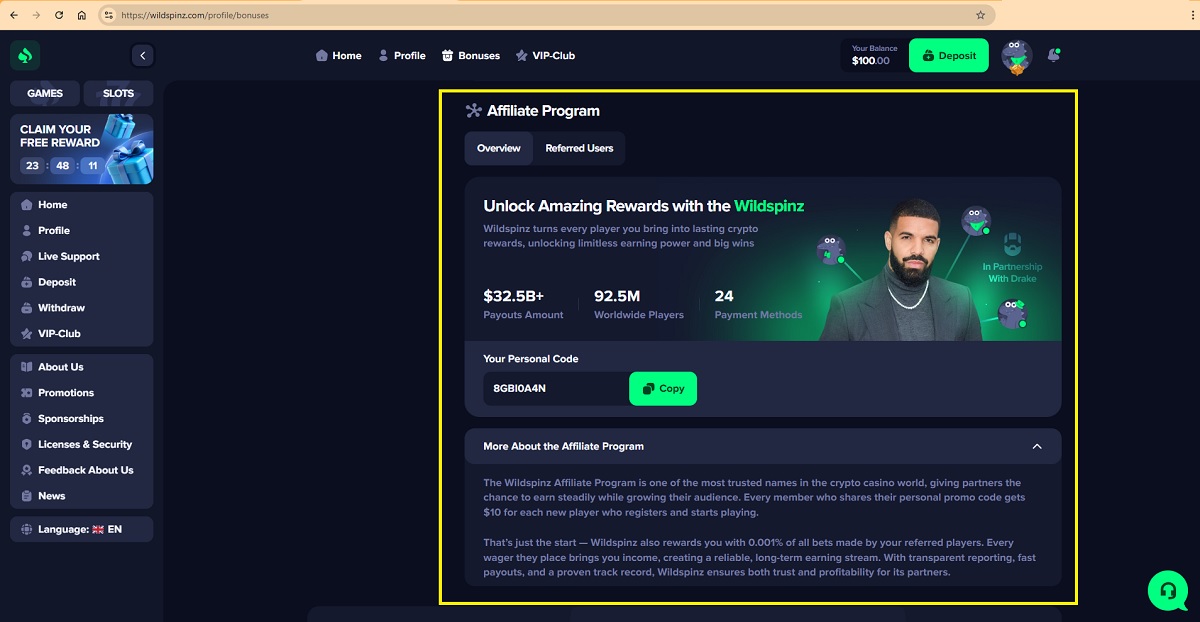 Based on the available public information, there is no verifiable evidence that a legitimate iGaming or crypto casino affiliate program operated under the name “Wildspinz Affiliate Program ” currently exists. The claims describing a Wildspinz Affiliate Program — including guaranteed payments of $10 per registered player, ongoing earnings of 0.001% of all bets, and references to transparent accounting and fast payouts — cannot be substantiated through reliable or industry-recognized sources.