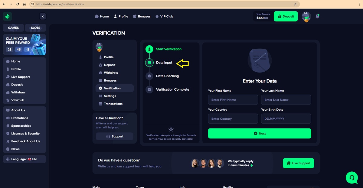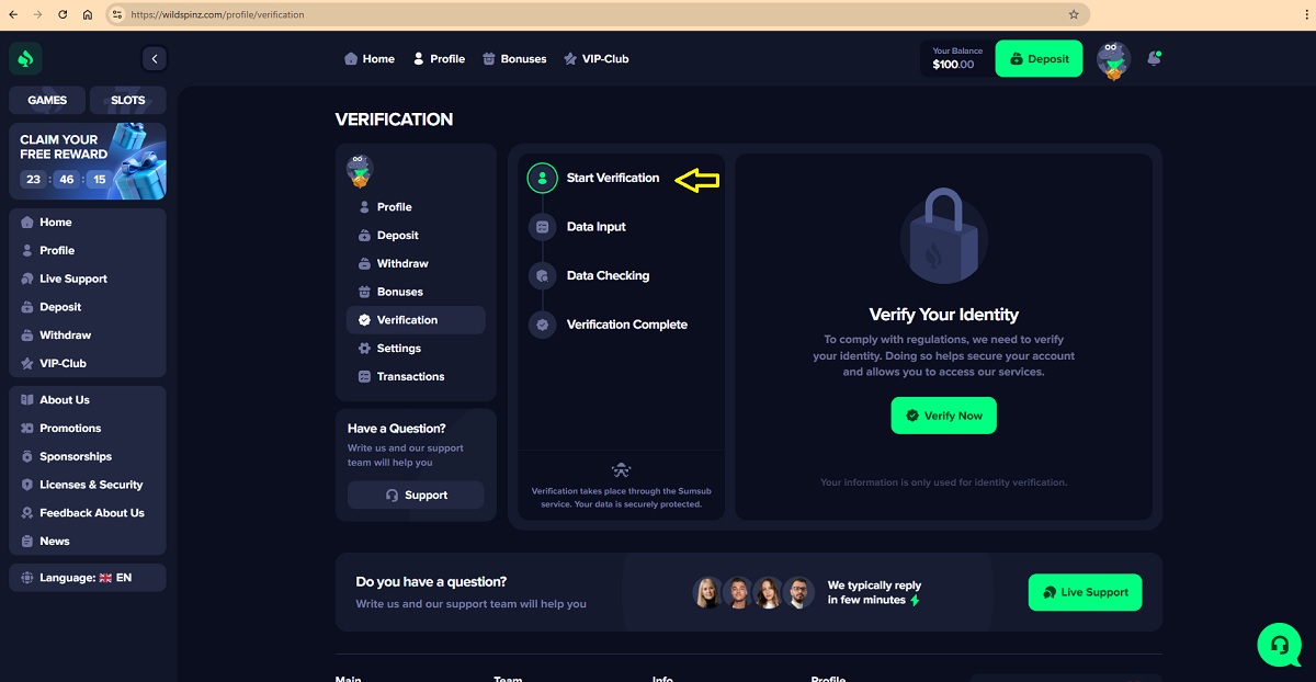 The alleged player account verification process on wildspinz.com represents a key scam pattern commonly used by fraudulent “casinos” to deceive players. When accessing their profile under the Verification tab, players are presented with a four-step process that is portrayed as a legitimate account verification procedure.