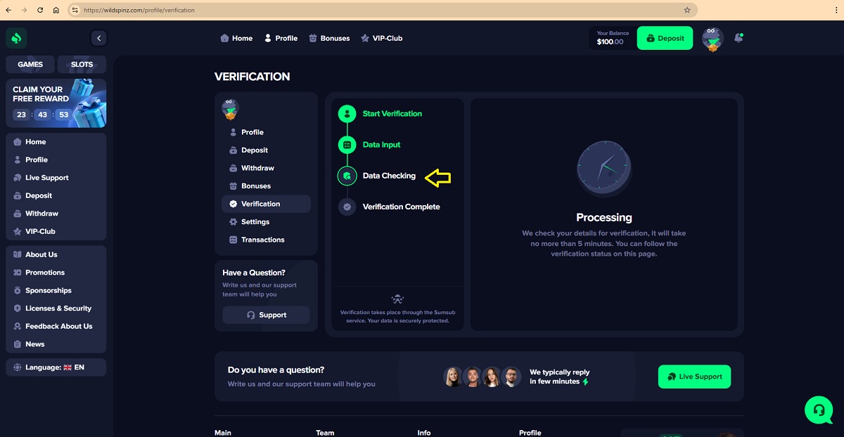 “We check your details for verification. It will take no more than 5 minutes. You can follow the verification status on this page.”
