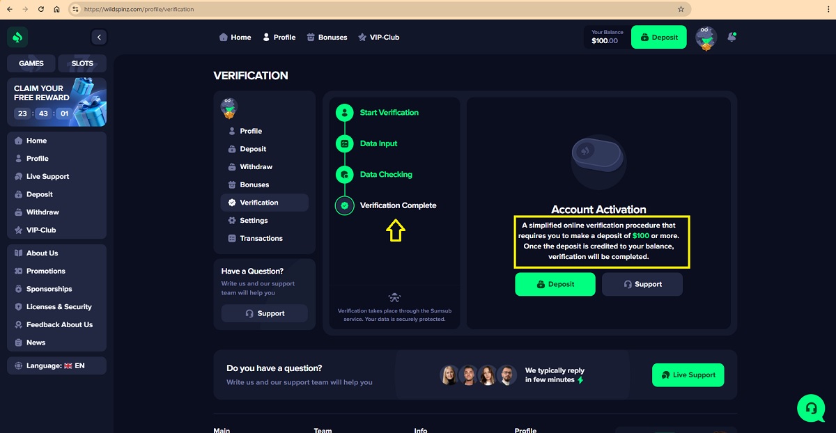 “A simplified online verification procedure that requires you to make a deposit of $100 or more. Once the deposit is credited to your balance, verification will be completed.”