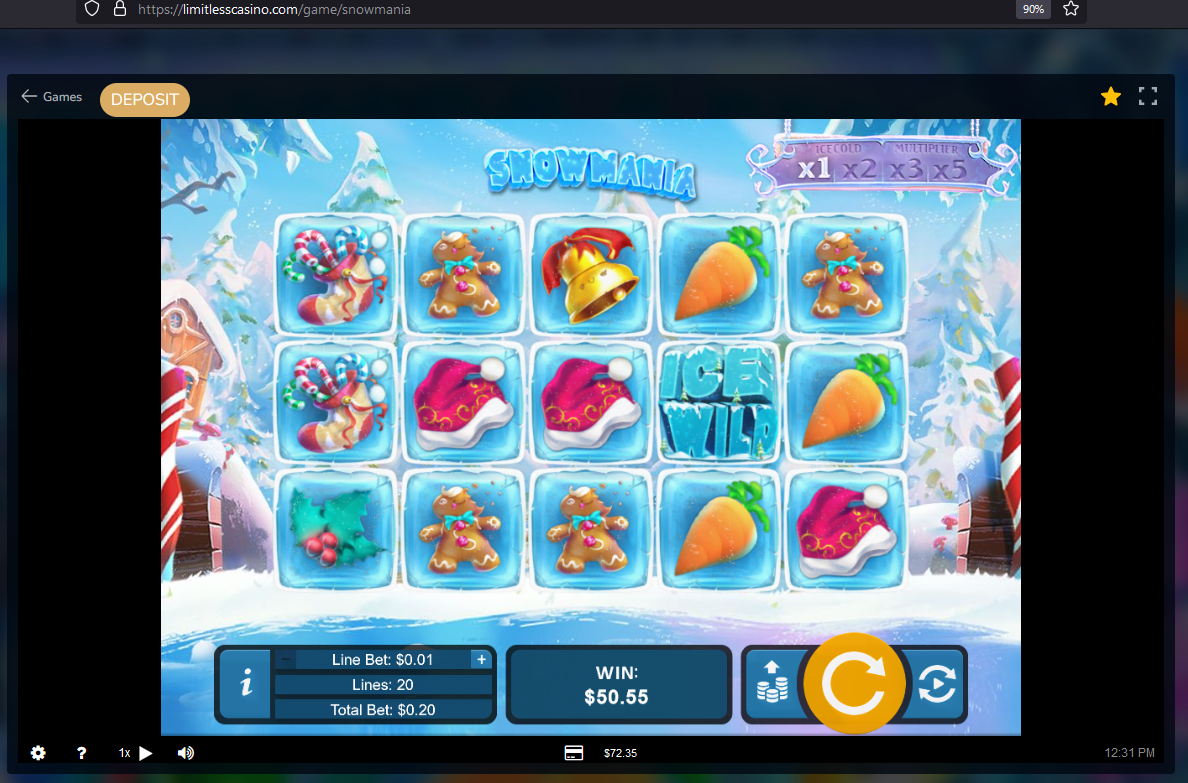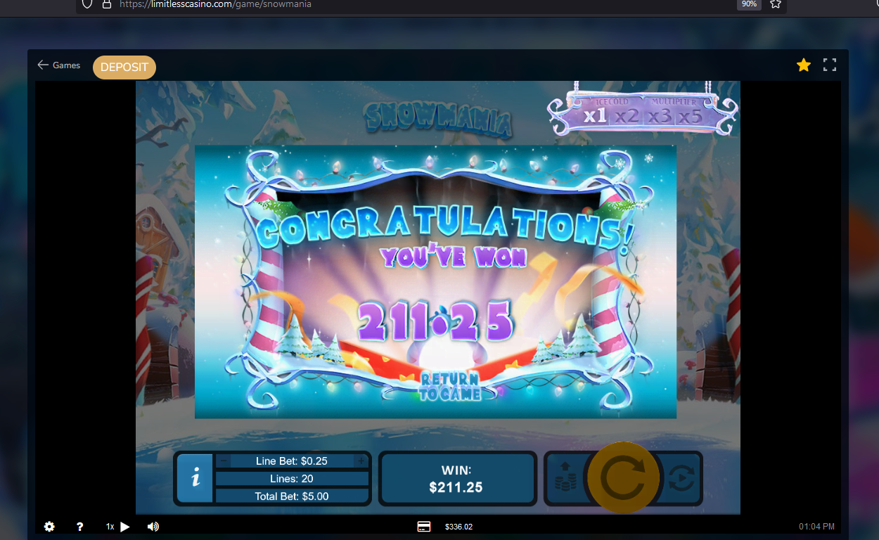 After 2 months of constant play for a win, I finally did it with the one casino that I had faith, determination, and trust in. LIMITLESS CASINO. I redeemed a 50 Free Spin bonus on Cash Bandits 2 and won $12.29. I started my play with my favorite slot, SNOWMANIA, falling down to $1.18. Miraculously, I managed to spin my way up to $336+. Although the max cash out was $50. But to make sure, I met the wagering of $653, I kept going until. The balance stopped when I met the wagering. I was able to receive my $50 BTC withdrawal in less than 10 minutes. Chat support was excellent supporting me with the details. Limitless Casino was my choice of testing. I played that casino almost everyday for 2 months, and the rules set by them was followed by them without any turmoil. Check out my plays on SNOWMANIA. Its been around, but with me it always picks my balance up.
