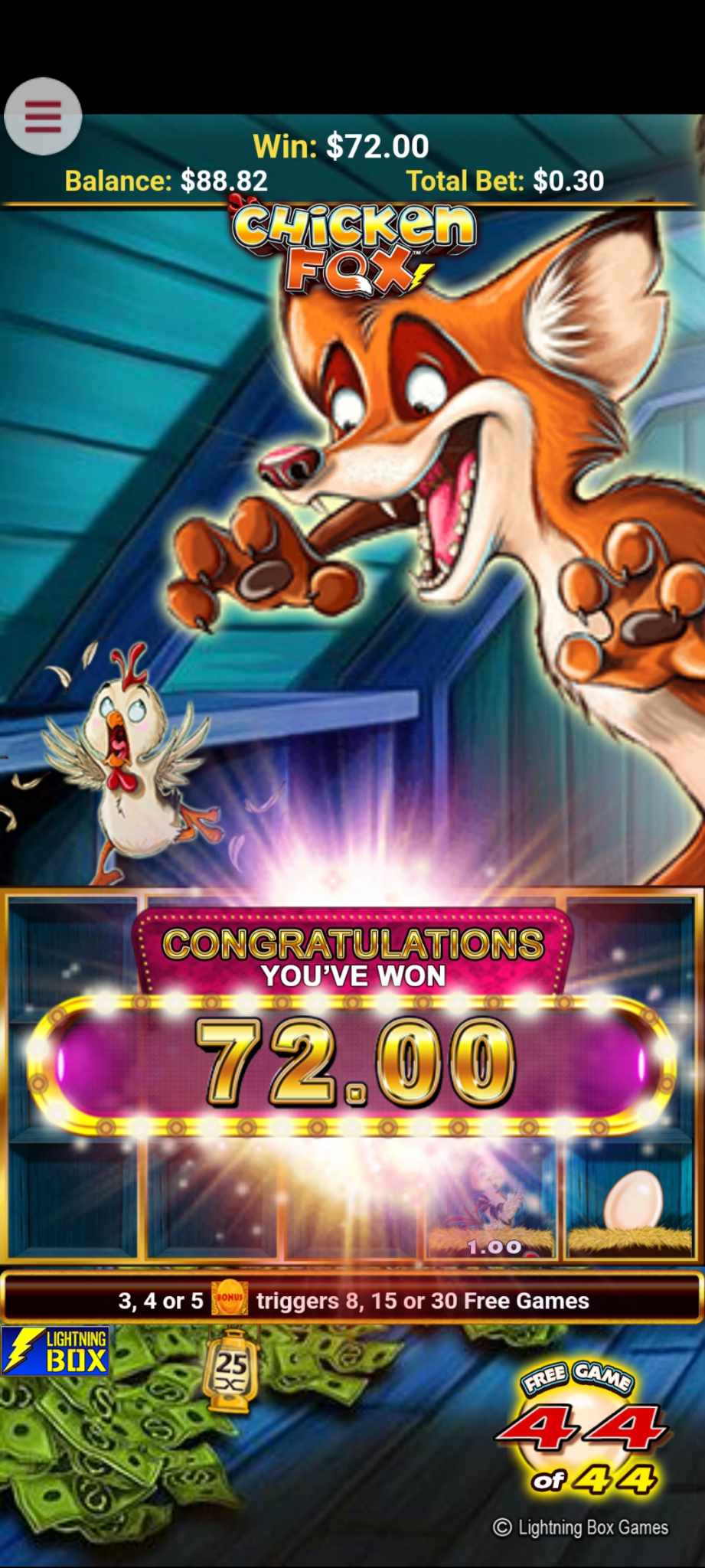 was doing 30 cent spins on the chicken fox slot, hit the bonus and won 8 free spins, kept triggering respins and ended up with 44 spins and 72$CAD off a 30 cent spin