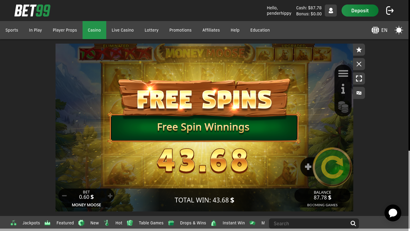 43.68$ off 60 cent spinsO caça-níqueis Money Moose estava pagando bem ontem