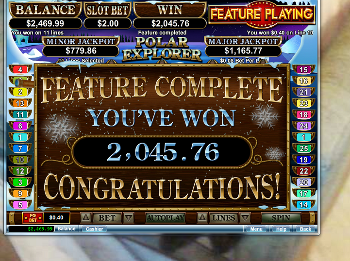 FINALMENTE... algo decente no Expresso Polar! Nem de longe tão bom quanto a vitória do Gunny! Poucos momentos depois... consegui uma bela rodada bônus no Dragão Místico, outro slot em que raramente me saio bem.