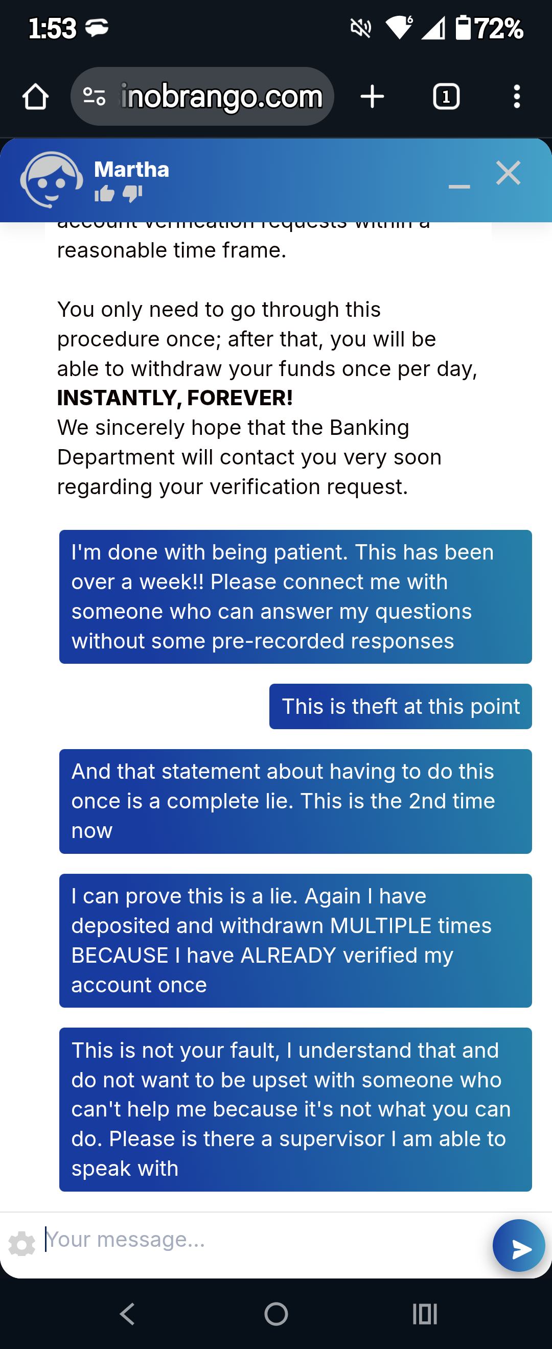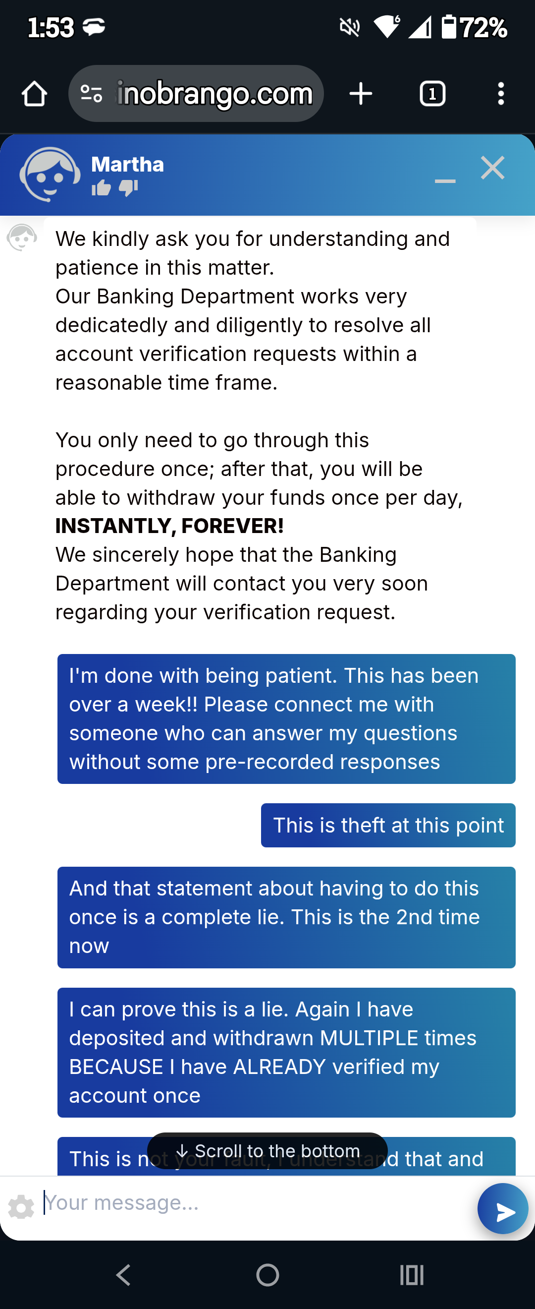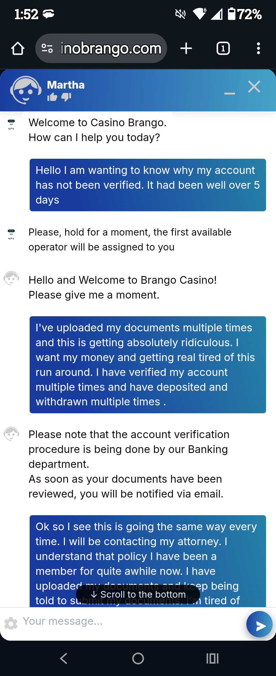O meu marido está com sérios problemas para levantar dinheiro do Brango. Somos ambos titulares de conta há alguns anos e já fizemos vários depósitos e levantamentos porque verificamos a nossa conta de acordo com as regras do site. Tentou levantar há uma semana e não recebeu nada além de ser instruído a enviar documentos para verificar a sua identidade. Já enviámos os documentos pelo menos 5 vezes e continuamos a receber instruções para enviar documentos em resposta. E o chat é inútil PORQUE NINGUÉM ESTÁ A DAR RESPOSTAS para além de uma maldita resposta! Como é que isso é aceitável? Mentem e dizem que só é preciso fazer este processo uma vez... e aqui estamos nós a andar em círculos só para levantar $100!!!