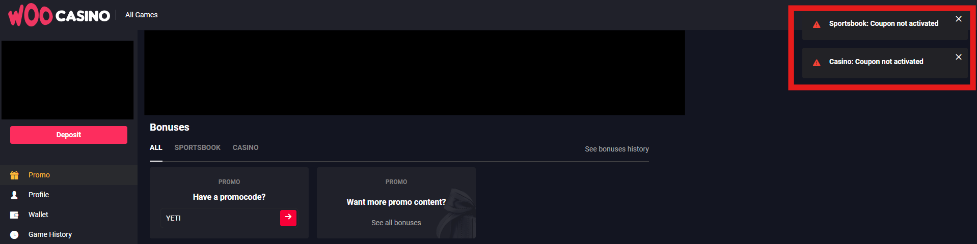 We have tested this bonus ourselves and were unable to redeem it; a pop-up appeared in the top-right corner indicating an issue: