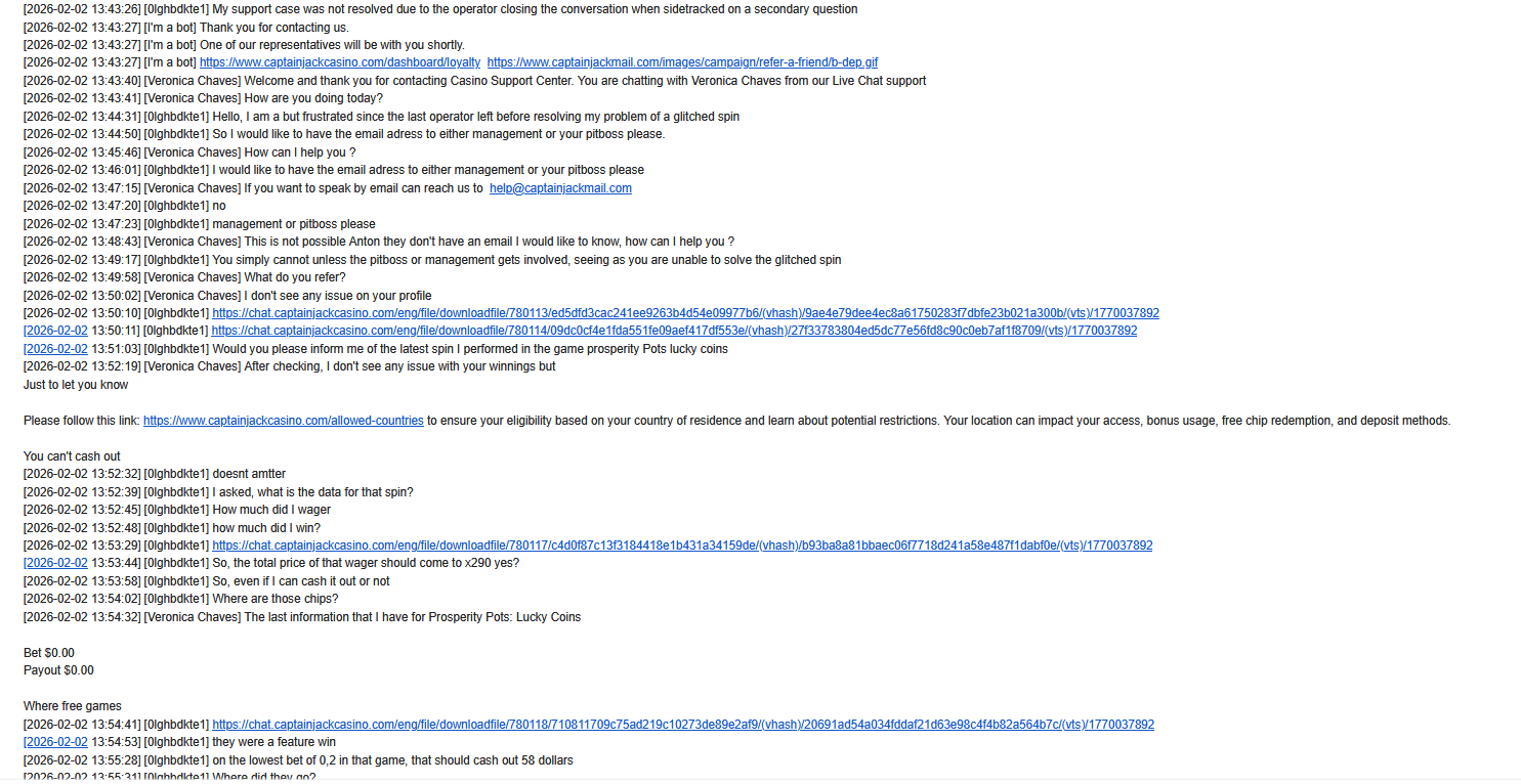 Eu estava a rodar os rolos na máquina Prosperity Pots: Lucky Coins e ela não pagou como deveria. Acionei a função "rodar e segurar" das moedas, que resulta num multiplicador de x290 da aposta mínima de $0,20. Isto deveria pagar $58,00. Paguei $2,80. Ao informar o casino sobre o sucedido, mostrando fotos como prova, contaram-me várias mentiras, tentando argumentar que o jogo estava a funcionar corretamente e distorcendo as regras intencionalmente. Guardei o histórico do chat e posso fornecê-lo mediante pedido. A imagem anexa comprova o resultado final da função.