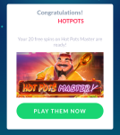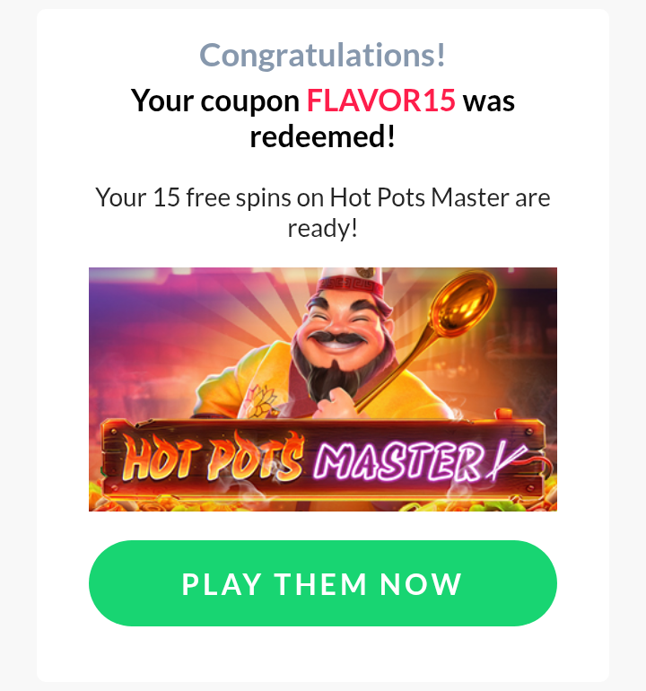 15 FREESPINS On the new game Hot Pots Master CODE: FLAVOR15 15 GIROS GRÁTIS no novo jogo Mestre das Panelas Quentes CÓDIGO: FLAVOR15