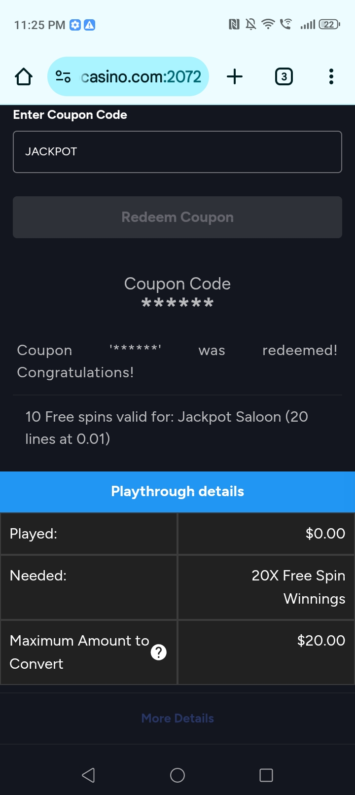 Código: JACKPOT; Valor: 20 jogadas grátis no Cash Jackpot Saloon; Aposta: x20; Levantamento máximo: US$ 20; Aposta máxima por mão: 5 dólares; Jogos permitidos: apenas NP Slots;
