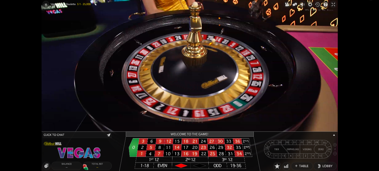 Pressionar 'jogar agora' no bônus não funciona, seu saldo será zerado, você precisa clicar na aba 'cassino ao vivo' (https://livecasino.williamhill.com/#!/), depois na opção roleta (senhora de blusa amarela) e escolher a mesa. Você não precisa jogar na de Las Vegas, eu joguei na mesa de 10p.
