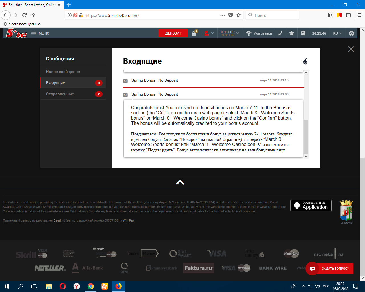 Minha conta não foi suspensa!!! Só que roubaram meus 381 euros. A casa de apostas 5plusbet ofereceu um bônus até 11 de março de 2018 - freeBET - 1000 rublos ou 14 euros ou 16 dólares! A aposta era de 10x. Registrei-me lá em 10 de março de 2018 e inseri todos os dados no meu perfil, pois, de acordo com os termos da promoção, para receber o bônus, é necessário preencher todos os campos do perfil MESMO!!! No dia 11 de março de 2018, às 9h, recebi um freeBET de 14 euros! Apostei e ganhei, conseguindo assim ganhar 381 euros! AGRADEÇO O HISTÓRICO DE APOSTAS E TAMBÉM AS COMPARTILHAMENTOS DE TELA COM O SITE DELES! TAMBÉM TENHO A TELA DA MINHA CONTA DE 12 DE MARÇO DE 2018! RECEBI UMA ENROLAÇÃO DE CARTAS DELES COM O RECEBIMENTO DE UM BÔNUS NO DIA 11 DE MARÇO DE 2018 ÀS 9 DA MANHÃ! E TELAS DE CORRESPONDÊNCIA COM ELES. Em geral, ganhei o bônus na segunda-feira, dia 12 de março de 2018! Ganhei 381 euros! Então comecei a enviar documentos para eles - um passaporte e uma autorização de residência. Em geral, fui verificado em 15 de março de 2018! Em 16 de março, coloquei o dinheiro na tela para a conclusão! Às 19h00 recebi uma carta deles - você preencheu o perfil em 15 de março de 2018! Por que eles mentem! Quando preenchi o perfil em 10 de março de 2018, caso contrário, não receberia o bônus em 11 de março de 2018! Fiz tudo certo. Eles levaram o prêmio! 381 euros! Acabei de pesquisar o motivo para não pagar e disse que o perfil foi concluído em 15 de março de 2018! Reclamei por escrito no guia deles! Me ajudem a conseguir um ganhador! Obrigado.