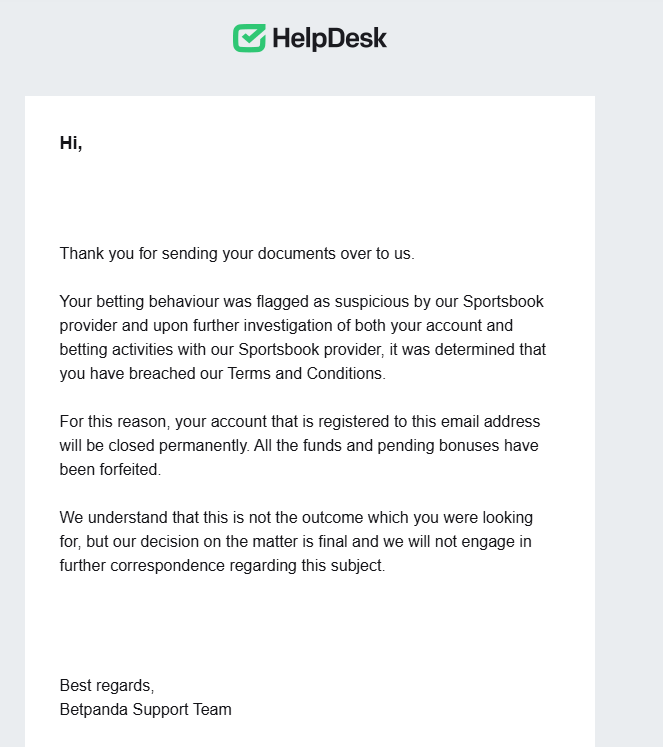 On 27th of april my account was banned 30 seconds after requesting an withdrawal of 18.2mbtc. Shortly after i received an email requesting KYC, to which i have sent the requested documents 20 minutes after the request. After 8 days of radio silence from betpanda, i have received another email saying the following: